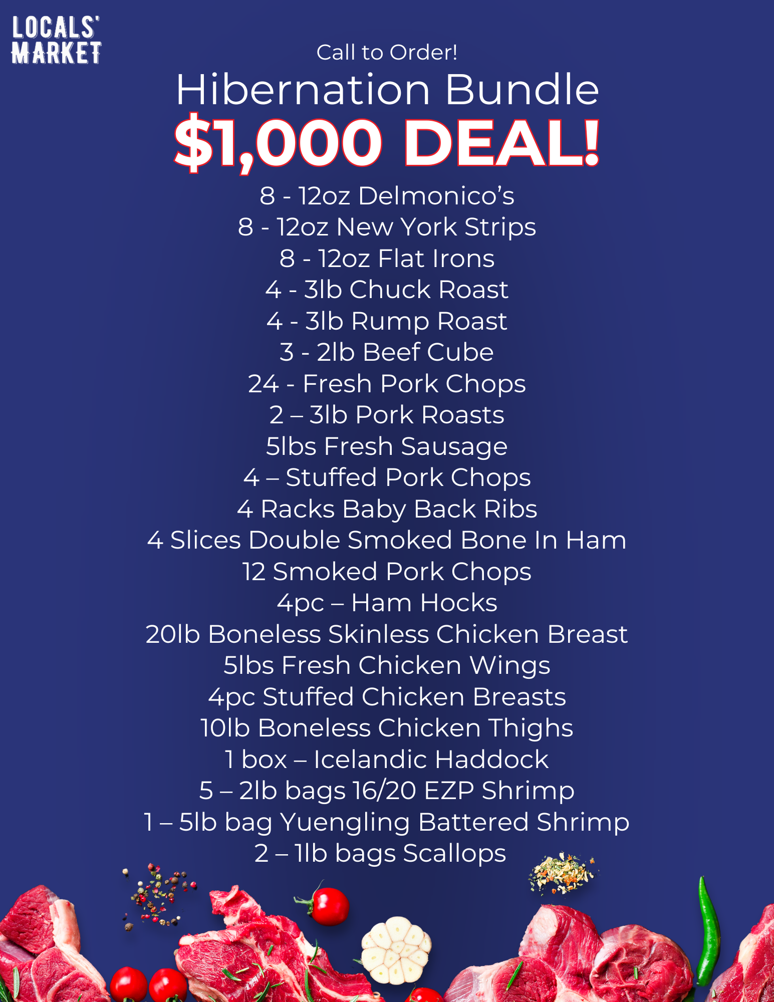 Enjoy bundle options including chuck roast, chicken breasts, new york strip steaks, shrimp, crab, and much more!